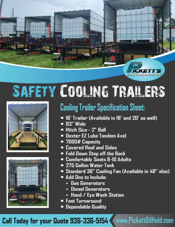 SAFETY COOLING TRAILERS – Here at Pickett’s Used Equipment located in Texas we have been manufacturing NEW Cooling Trailers for years as we understand the effects of the high temperatures as it applies to the safety of employees and their productivity. We build our trailers tough to withstand everyday use, rugged terrain, and for convenience of moving to different locations. Trailers can be delivered from our location in Liberty, TX to your location. For more information give us a call at 936-336-5154 or email us at Sales@PickettOilfield.com ~ Learn more at